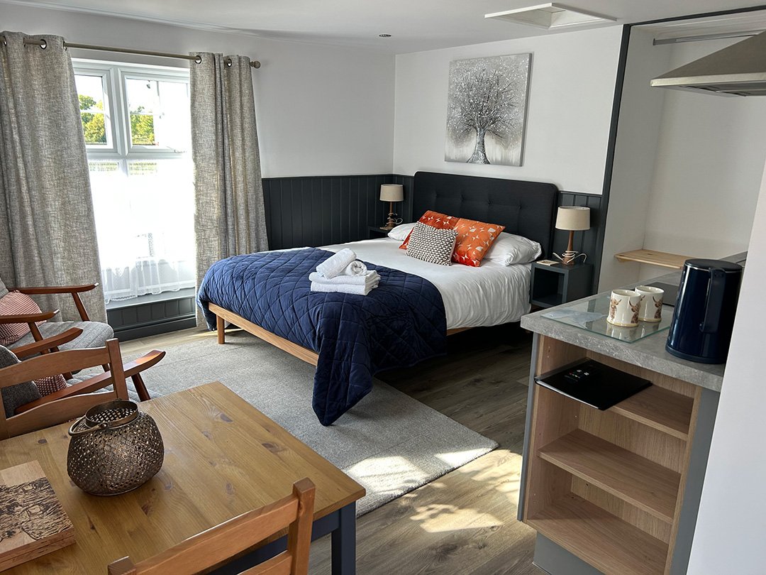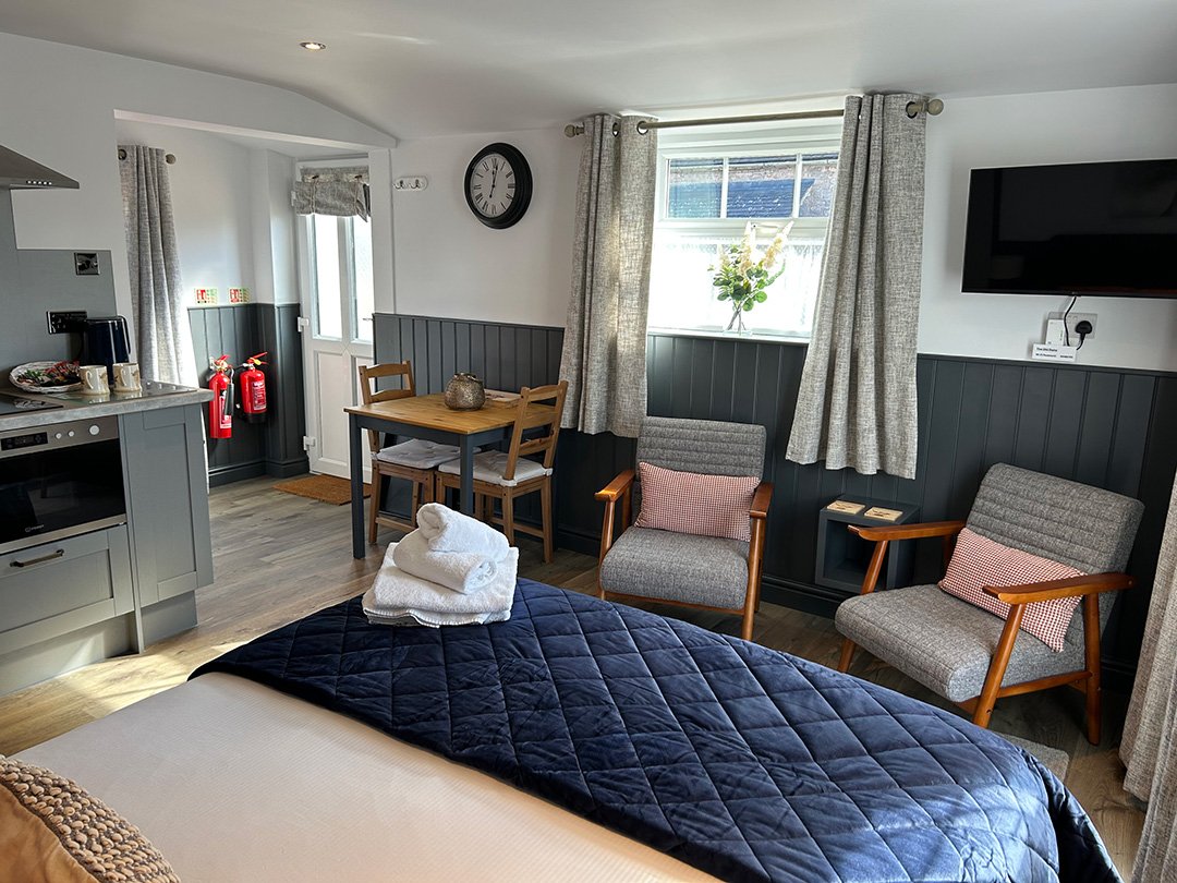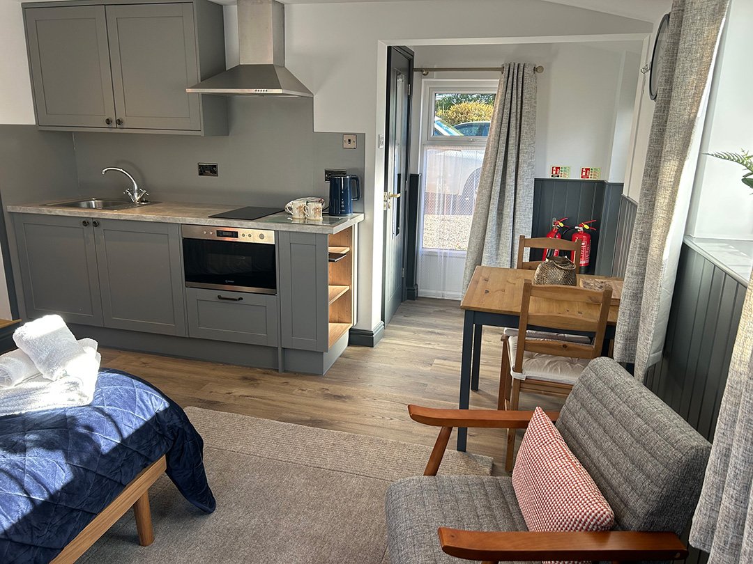 Whether it’s a quick breakfast or a light supper, the compact yet fully equipped kitchenette has you covered — complete with kettle, toaster, microwave/grill, hob, and all the kitchen essentials.