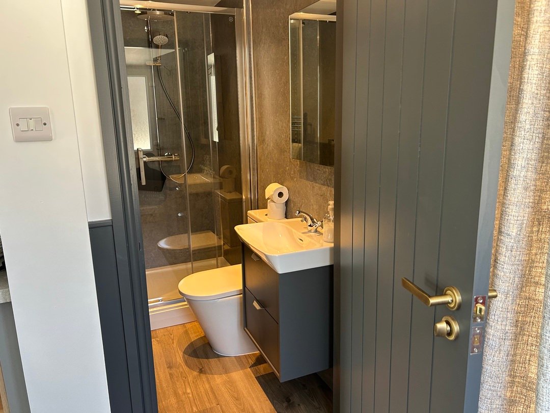 Enjoy a restful night’s sleep in a comfortable king-size bed dressed with soft linens, with convenient clothes-hanging space nearby. The en-suite shower room is thoughtfully equipped with a WC, basin and mirror, and a shower offering both handheld and waterfall heads. A hairdryer is also provided for your convenience.